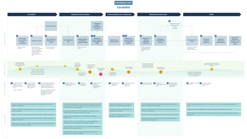 Following a comprehensive Job To Be Done table, I created two experience maps based on the profiles of Julien and Estelle. It is a simplified version of Julien's experience map. By understanding the pain points highlighted in the experience map, we can design an application that enhances Julien's user experience by