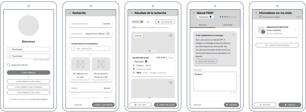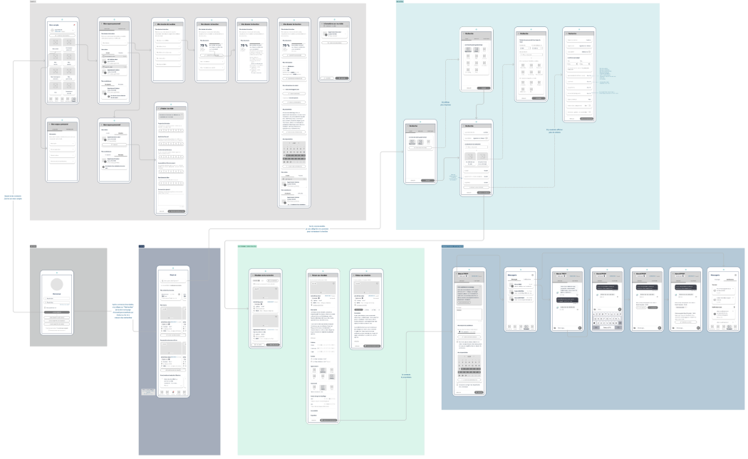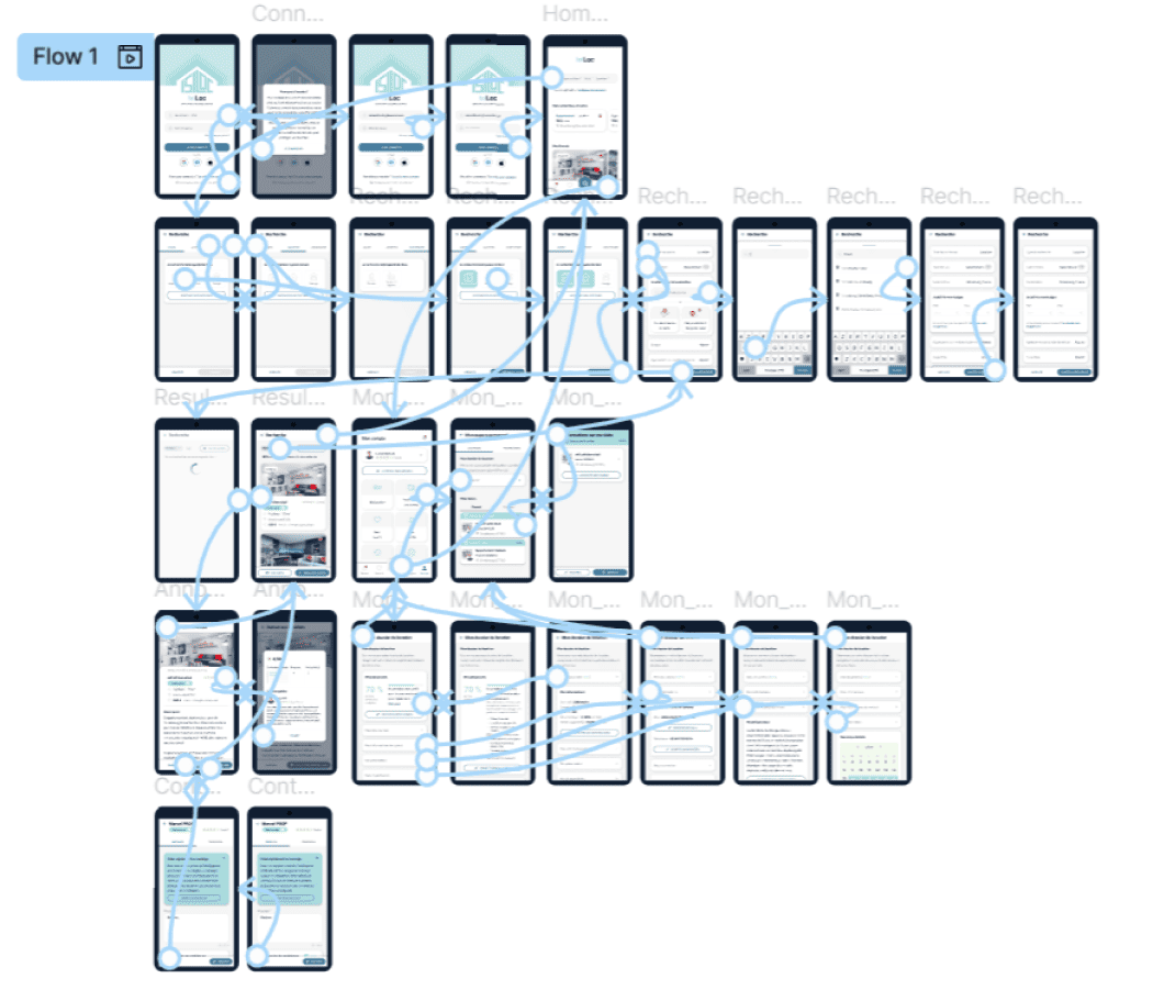These represent the complete user journey on the future application. No frills, details, or colors here—just a representation of all the pages visible to the user. The idea is to iterate, present the concept to stakeholders, and collaboratively validate a final user flow.