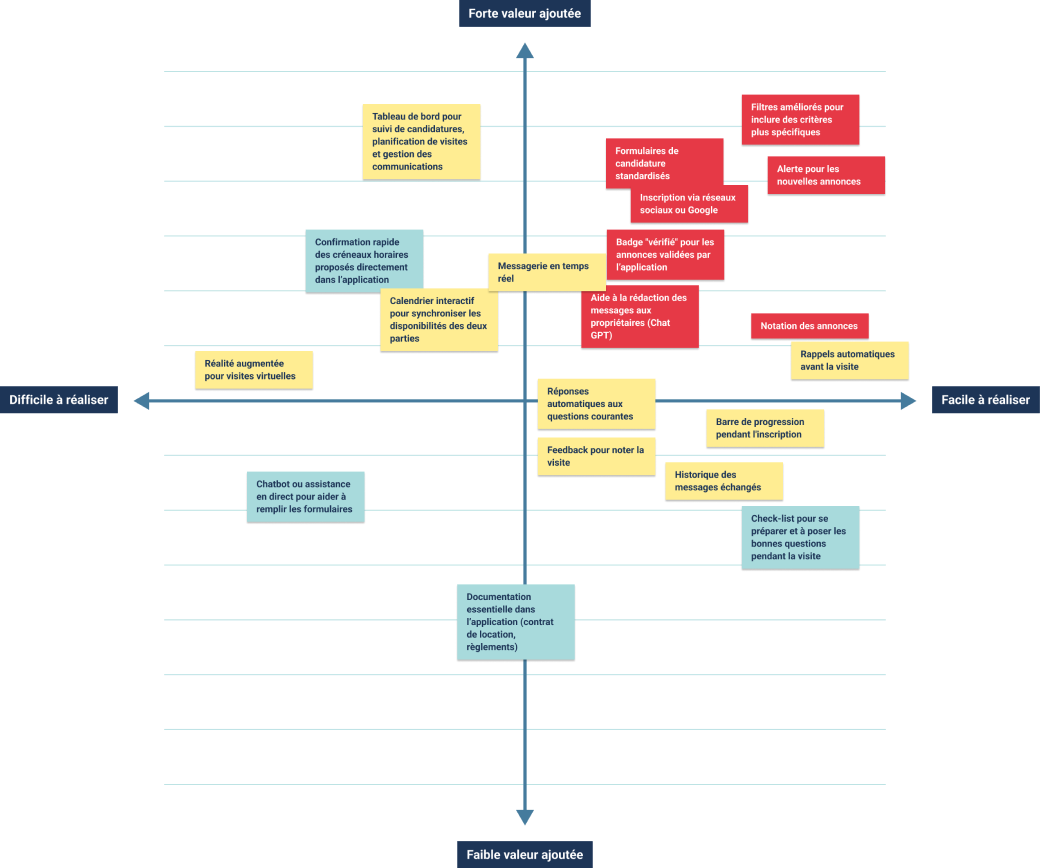 Following my experience map, I proposed a set of features to address the gaps that currently exist. Using this matrix, I prioritized these features based on their added value and ease of implementation within the scope of my project.